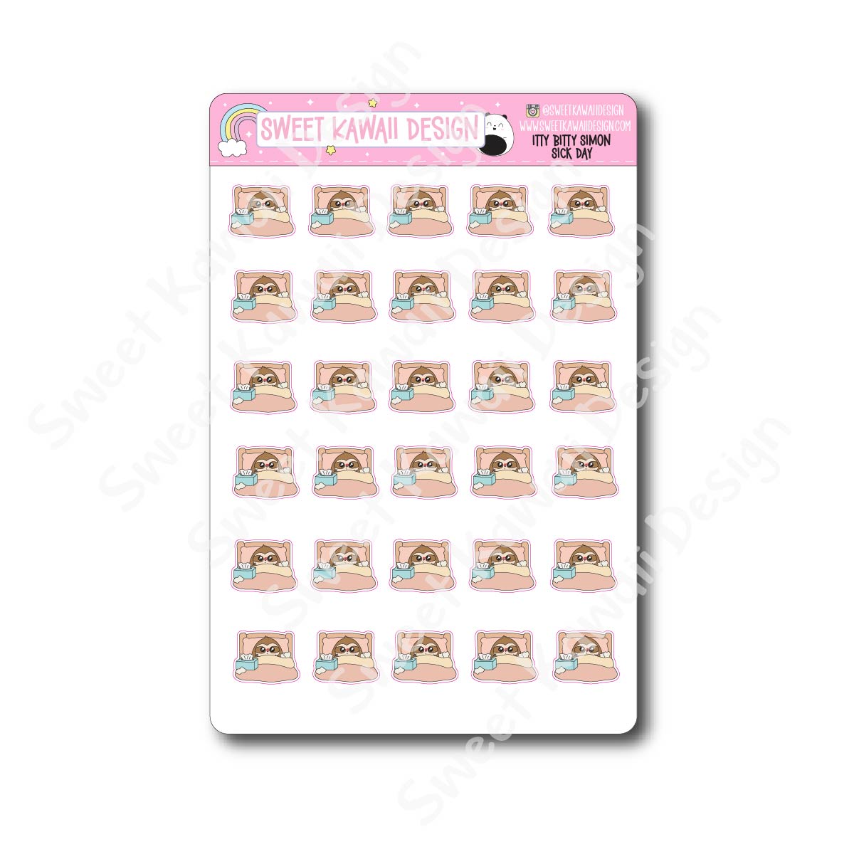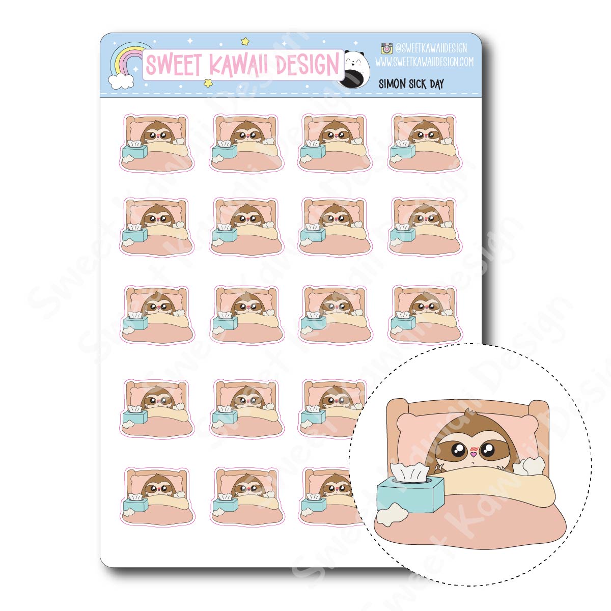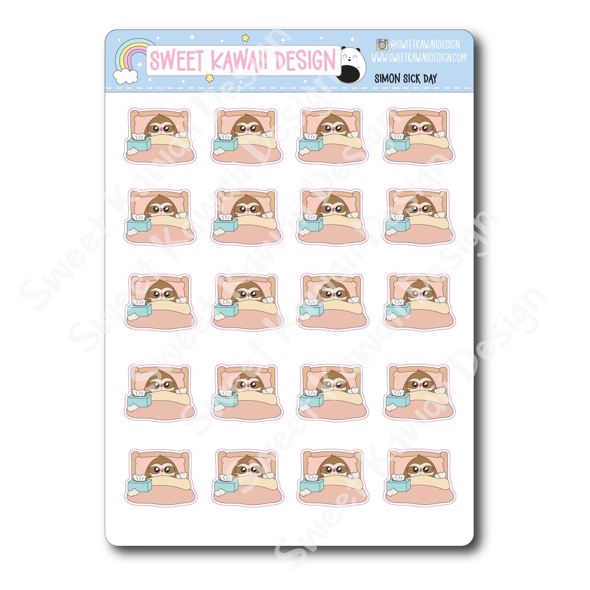 Simon is sick in bed with tissues close by, taking a much-needed rest day. Perfect for marking sick days, recovery time, and low-energy weeks.
