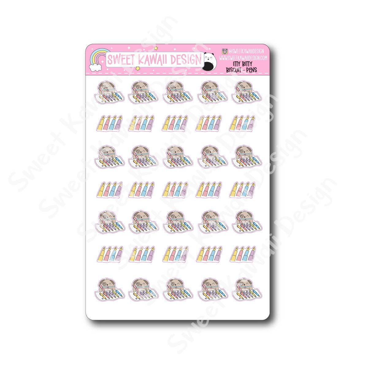 Biscuit is in his happy place—surrounded by a table full of beautiful fountain pens. Perfect for stationery lovers, pen collectors, and anyone who believes you can never have too many pens.