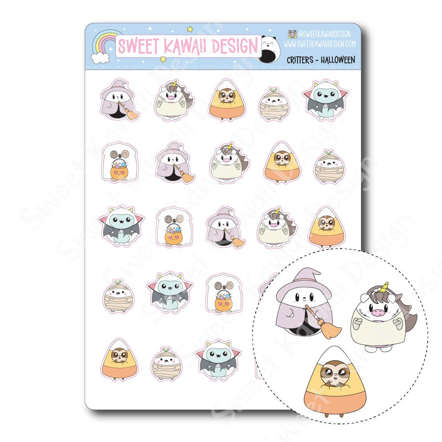 Your favorite Sweet Kawaii Design critters are all dressed up for spooky season! This sheet showcases the gang in adorable Halloween outfits—tiny witches, cheerful vampires, mummies, and more—ready to add a playful pop to any planner spread, journal page, or happy mail.
