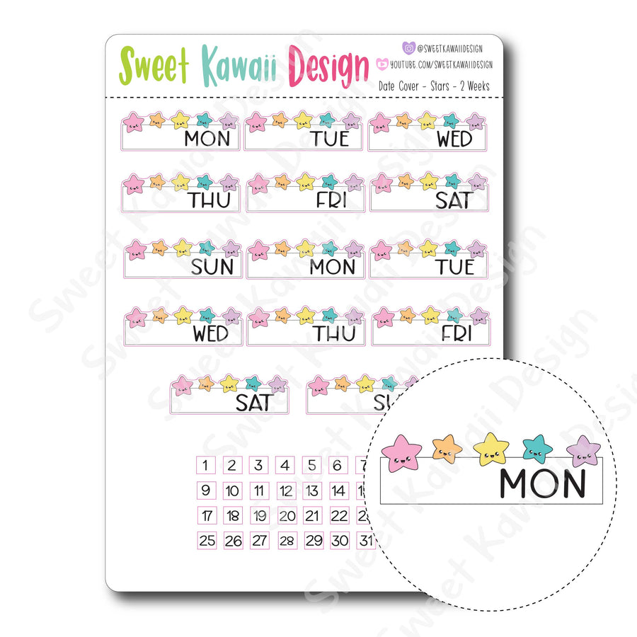 Keep your head out of the clouds and in your planner with these fun date covers! Each sheet contains 2 weeks of date covers. Due to the size of the itty bitty covers the stars do not have faces.