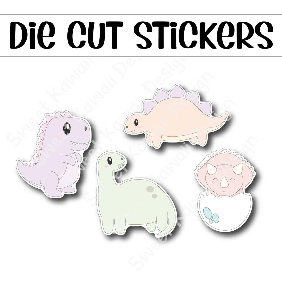 This listing is for 4 die cut stickers! Each dino varies in size but average 2.5" in height.