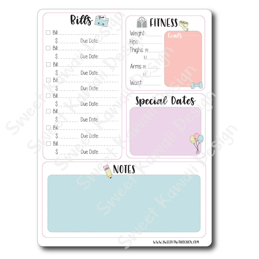 You know that page in your Erin Condren planner, the one right before the monthly overview that you have no idea what to do with? That is what this sheet of stickers is for! Cover up those awkward boxes with these cute stickers and make that page work for you! This sheet includes the 4 main stickers you need to cover each of those boxes up perfectly.