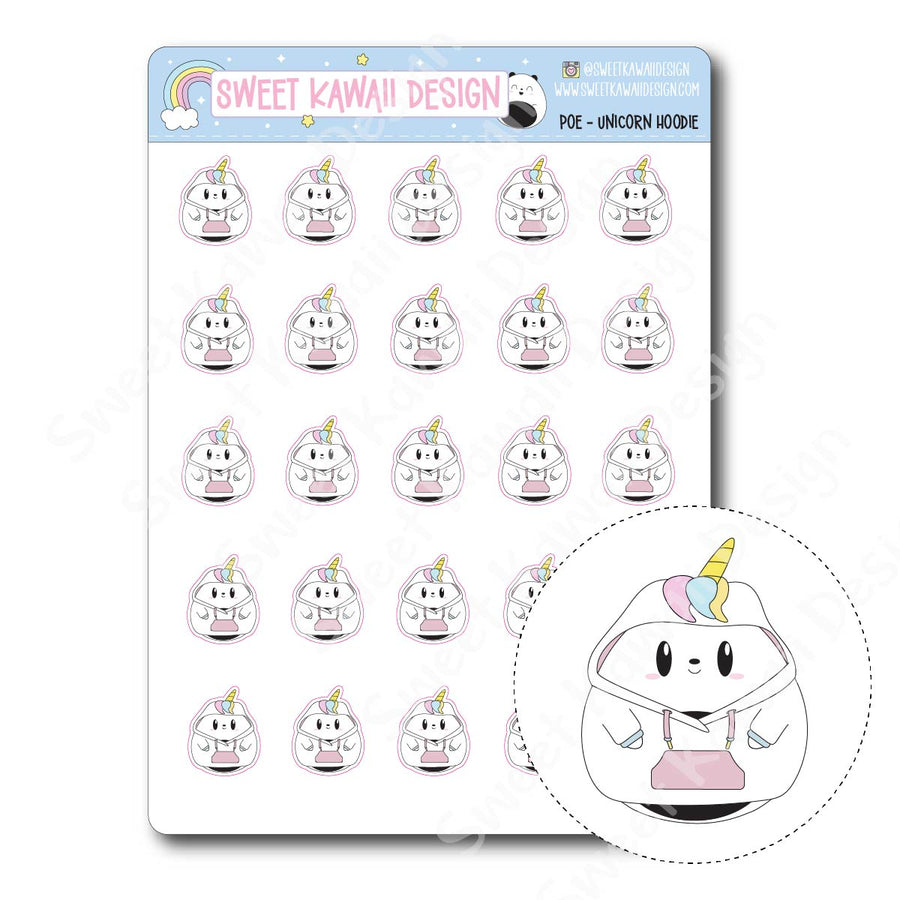 This sticker sheet features our favorite panda, Poe, rocking a magical unicorn hoodie—complete with pastel colors, a shiny horn, and some serious Peggy vibes. Whether he's channeling his inner unicorn or just trying to blend in with the squad, Poe is serving up pure kawaii. Perfect for adding a little sparkle (and silliness) to your planner or journal!