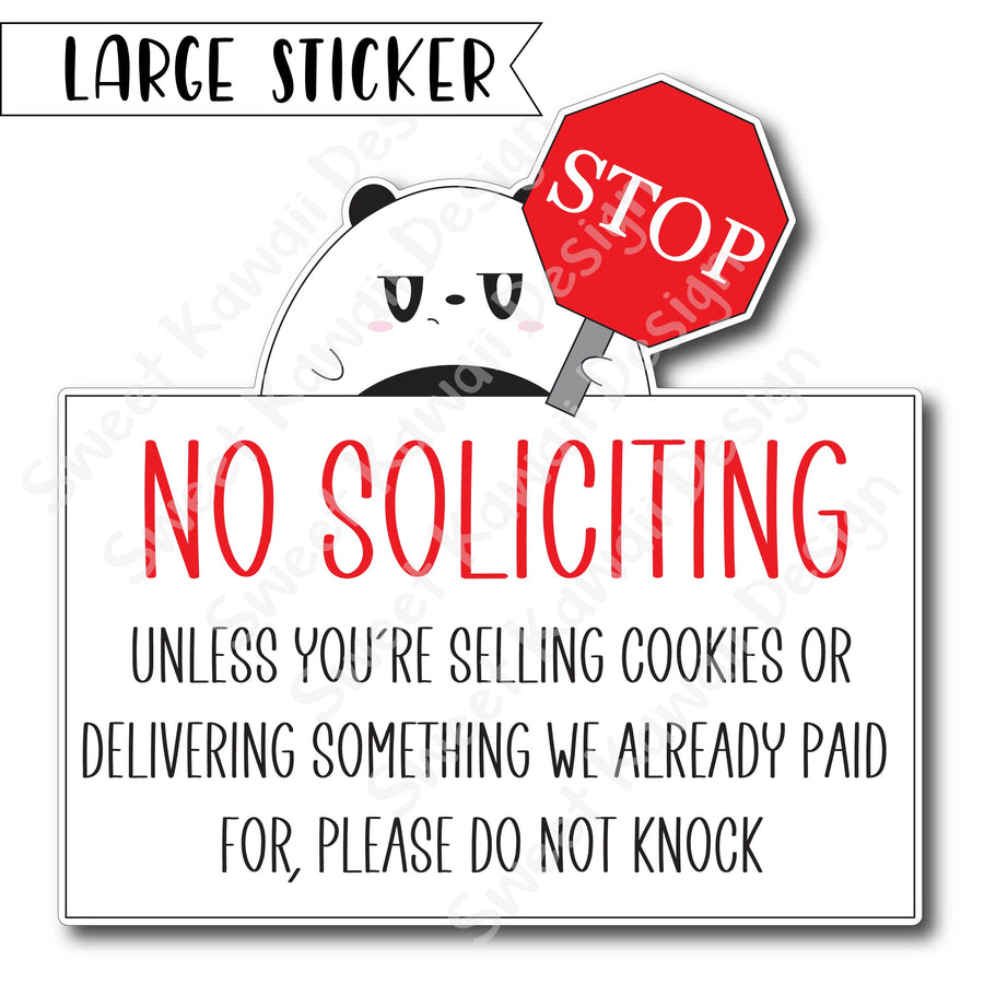 This listing is for one LARGE sticker to help keep those solicitors away! Printed on the same removable vinyl as our planner stickers this sign works great on smooth surfaces such as a window. Stick it directly to a window pane or to something smooth and rigid to make your own sign!
