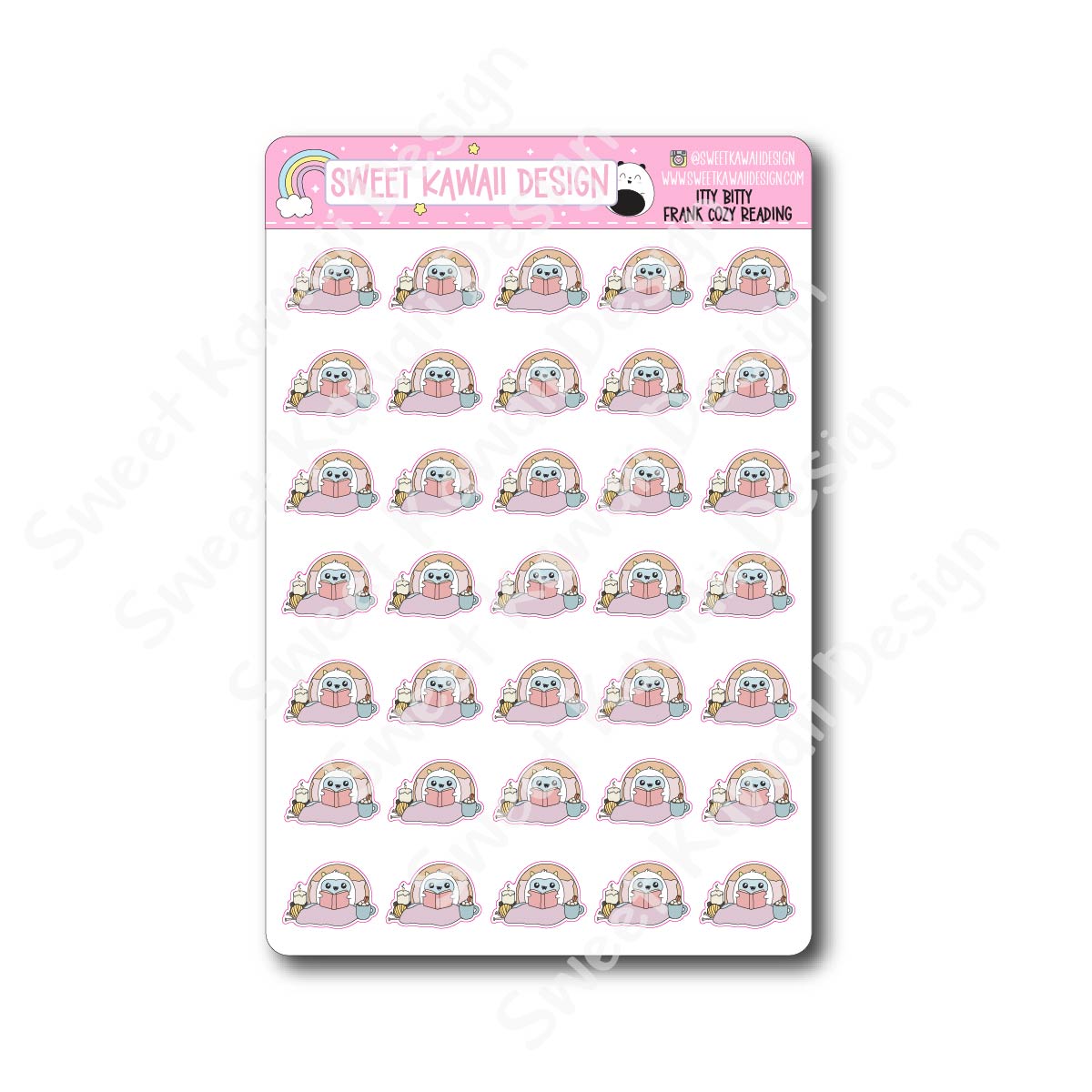 Frank is fully committed to the cozy life in this sticker sheet, featuring him snuggled up in bed with a good book. Perfect for marking quiet nights, reading time, or slow, restful days in your planner. Soft, snuggly, and full of calm vibes—this sheet is made for bookish moments and cozy winter spreads.