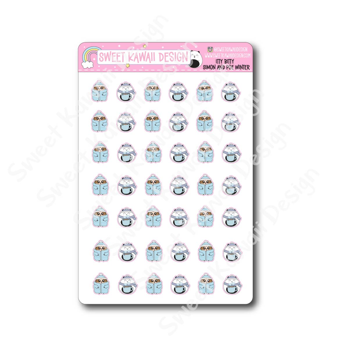 Bundled up and braving the cold in the cutest way! This sticker sheet features Simon in a big puffy jacket and Poe wrapped up in a cozy hat and scarf while sipping a warm drink. Perfect for marking chilly days, winter outings, or cozy coffee runs in your planner. Sweet, seasonal, and full of cold-weather charm.