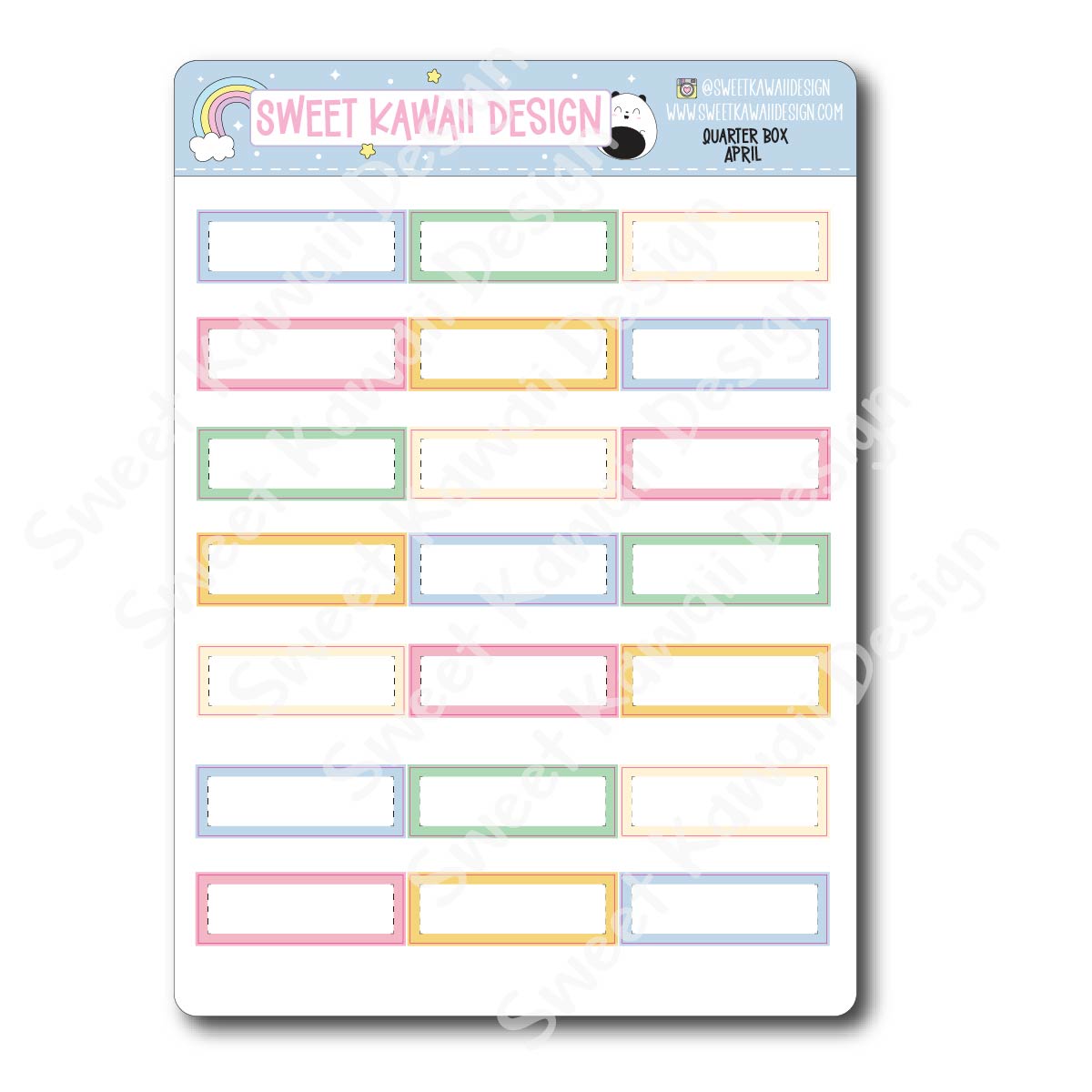 These stickers are modeled after our vertical kits. Full boxes stand at 1.9" tall. Quarter, Half and Full boxes are 1.5" wide.