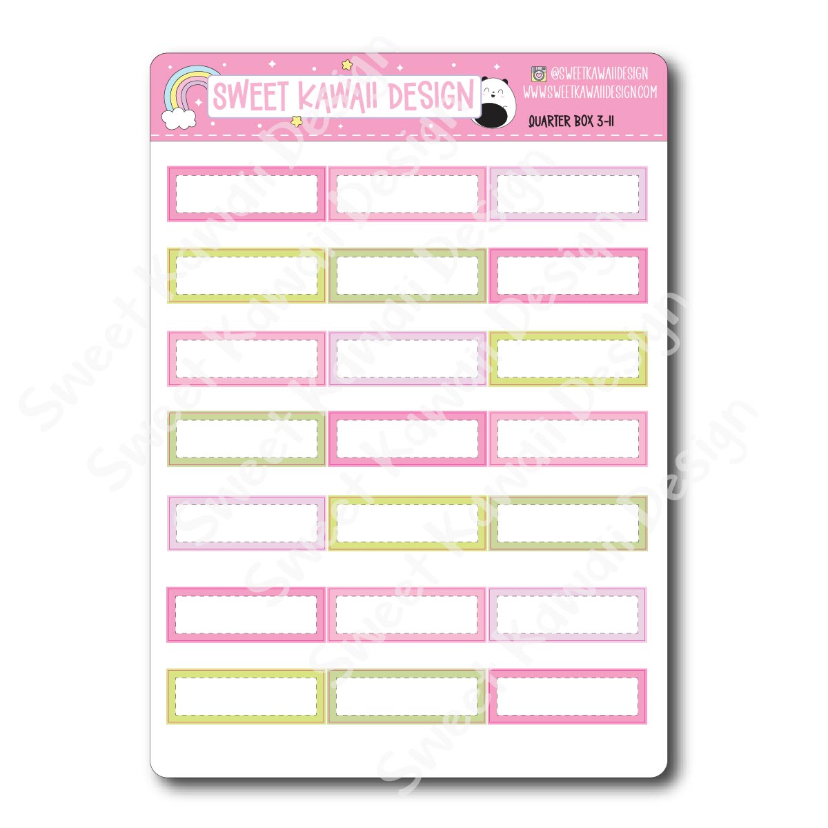These stickers are modeled after our vertical kits. Full boxes stand at 1.9" tall. Quarter, Half and Full boxes are 1.5" wide.